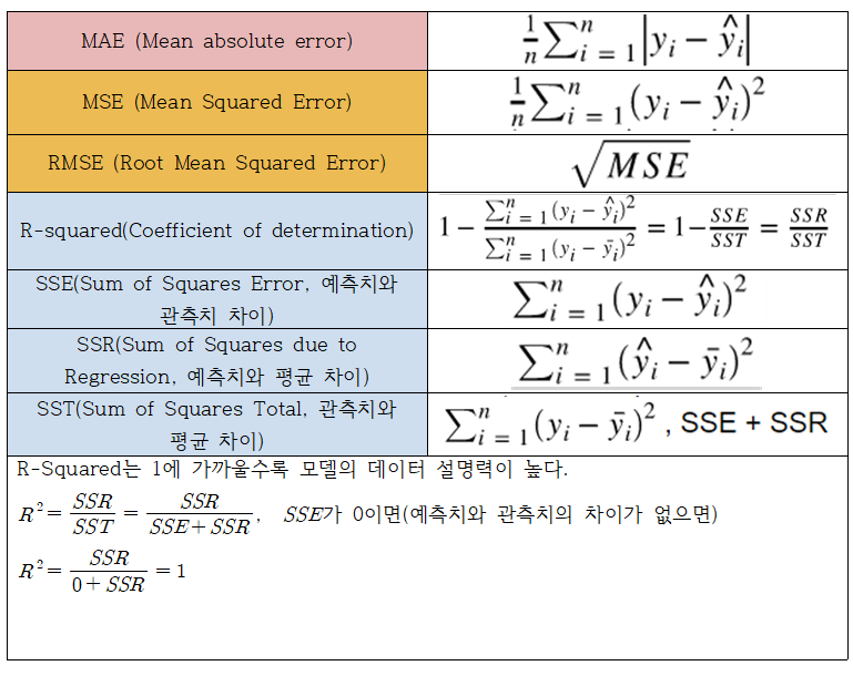 생성된 회귀모델을 평가하는 지표는 MAE, MSE, RMSE, R2가 있고 그 뜻은 다음과 같다.