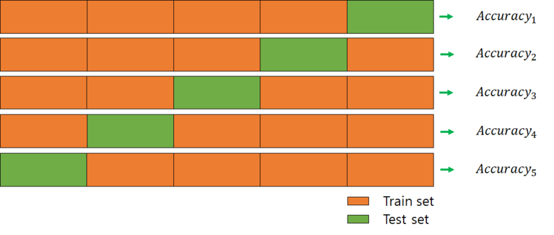 train set과 test set으로 평가를 하고, 반복적으로 모델을 튜닝하다보면 test set에만 과적합되는 상황이 발생. 이를 해결하고자 하는 것이 바로 교차 검증(cross validation)이다. test set을 하나로 고정하지 않게 한다.