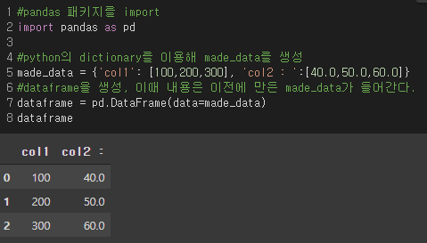 위와 같이 DataFrame을 생성하게 되면 행이 0,1,2 열이 col1, col2인 2차원 배열 데이터가 생성이 된다.