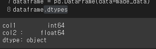 생성된 DataFrame의 데이터 타입을 보기 위해서는 DataFrame 객체 뒤에 dtypes를 적어주면 된다.