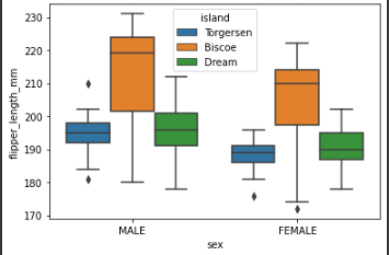 일단 우리는 섬마다 분포하는 펭귄의 지느러미 길이를 성별을 나누어 표시를 해보겠다.